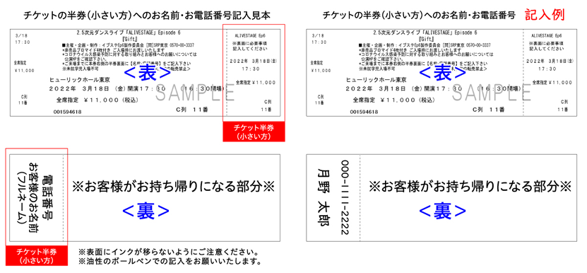 ・感染症拡大防止に伴う追跡確認迅速化のため、ご来場いただくお客様には、お名前と電話番号を事前にチケットの半券(小さい方)に明記して、ご来場いただけますよう、お願いいたします。