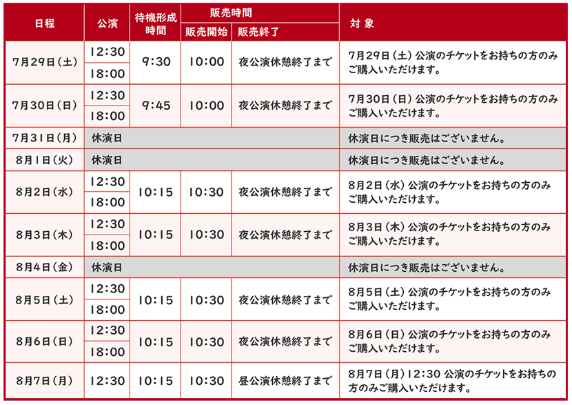 7月29日(土)~ 8月7日(月)の公演のグッズ販売情報を更新いたしました。
